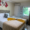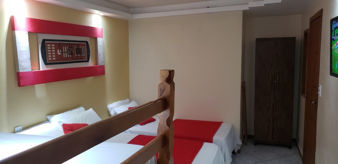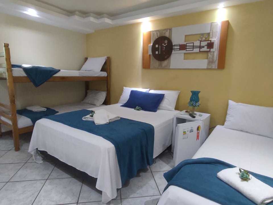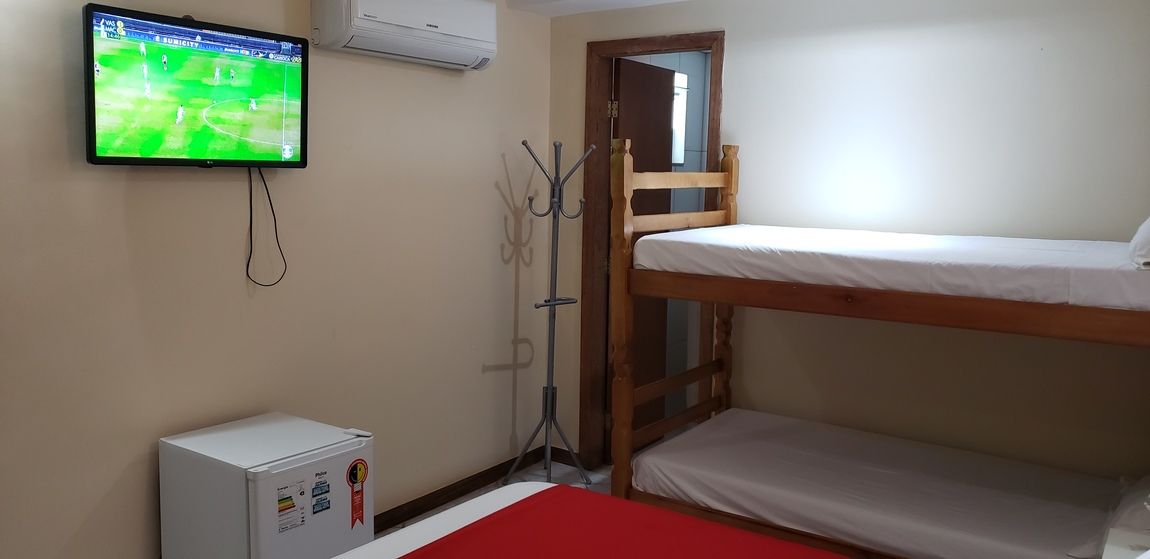 Este quarto quádruplo oferece frigobar e ar-condicionado.